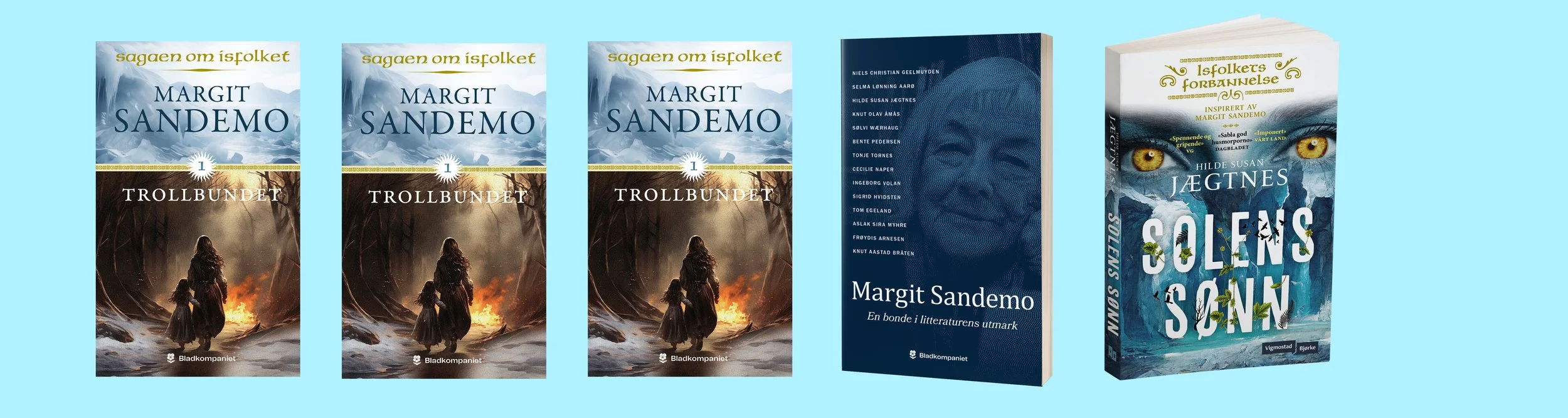 Men feiringen av Margit hadde faktisk begynt en god stund før selve fødselsdagen. I februar ble Solens sønn av Hilde Susan Jægtnes lansert, den første boken i en trilogi basert på karakterer fra SAGAEN OM ISFOLKET. Margits familie ga forfatteren tillatelse til fritt å benytte seg av Isfolkets persongalleri, og de visste at stoffet var i trygge hender: Hilde kan ALT om Isfolket. I Solens sønn får leserne møte heksen Hanna som ung pike – altså en god stund før hun blir den skumle trollkvinnen som opptrer i Margits bøker. Solens sønn er imidlertid ikke den eneste boken fra Bladkompaniet i anledning hundreårsjubileet. En rekke forfattere og kulturpersonligheter ble invitert til å skrive et bidrag om sitt forhold til Margit Sandemo, og disse tekstene utgjør antologien Margit Sandemo – en bonde i litteraturens utmark. For det var nettopp det Margit kalte seg selv, «en bonde i litteraturens utmark», og den sandemoske utmarken var svært frodig og fruktbar og resulterte i nærmere 200 titler i løpet av hennes karriere. Antologien er en morsom, interessant og velfortjent hyllest til jubilanten og viser både kjente og mindre kjente sider av den folkekjære forfatteren. I tillegg er også de tre første bøkene i serien SAGAEN OM ISFOLKET utgitt på nytt, med nye omslag signert en av våre fremste designere.